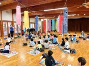 クラスの一人一人が作ったこいのぼりを並べて、それを見ながら皆で顔を合わせて