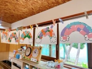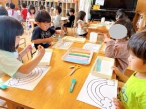 虹をカラフルにしたくて、いろいろな色画用紙をたくさん切っていましたよ✂