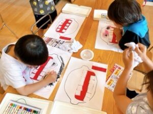 たくさん切ったものは、すずらん組は「虹」の絵に糊で貼って、色付けをすることに