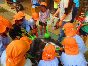 ひよこもも組さんが石鹸を使って泡立てていました。