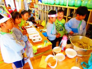 年中組と年長組の誕生会が開かれ、7月8月生まれの友達を祝いしました。