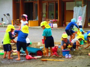 朝の登園後に、園庭の重い遊具を友達と助け合いながら出す年長組さんの姿がありました。