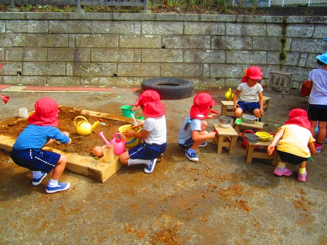 明るく暖かい春の日差しの中、保護者の方と年長児が登園してきました。