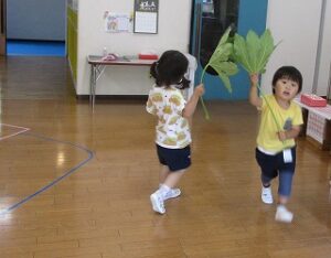 満3歳・年少児、昨日なかよし会で踊った『ゆうき音頭』を聞くとヤツデをもって、歩いたりジャンプしたりして遊ぶことが楽しくなりました。大きな葉っぱを持った子どもたち、元気パワーと笑い声が大きくなっていました。