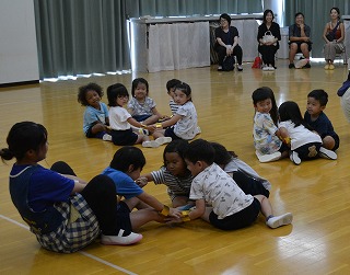 年長組はホールで踊りをして遊びました。大きな旗を持って元気に体を動かしています。友達と振り付けを考えていろいろな動きと旗の振り方を楽しんでいます。