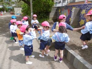 お弁当後の子どもたちの遊びは、綱引きが中心になっていました。年長さんの仲間に、小さい子どもたちが入って一緒に遊ぶ姿が見られました。まぼり幼稚園の子どもたちの仲良しの輪が広がってきています。