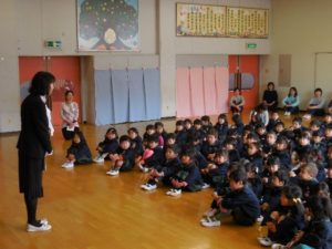 園長先生は絵を見せながら、子どもたちが今学期に楽しんだことやがんばったことを話してくださいました。そして、子どもたちは、一学期の出来事を思い出しながら、大きく頷いたり、にこっと嬉しそうな表情になったりしていました。夏休み中のお約束として、「挨拶しましょう。」「自分でできることは自分でしましょう。」というお話も聞きました。最後に今学期、お世話になった先生方に、お礼の気持ちを伝えました。終業式後は、来週の夏季保育について担当の先生からお話がありました。