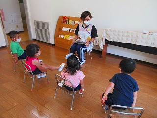 集合の時間、今日は手遊びをしたり、紙芝居を見たりしました。お返事の声が大きくなったり、ニコニコ笑って楽しんだりする姿を見ると、先生や友達と同じ場で過ごす安心感が大きくなっていることを感じます。