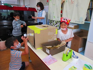 年中組はマイルスくんからお手紙が届きました。これまで頑張ったり楽しんだりしてみんなのパワーが大きくなったことを褒めてくれました。「明日の運動会頑張る!」子どもたちはニコニコになっていました。