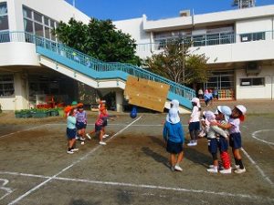 年長組は『知らない人に声をかけられたら…?』という設定で子どもたちが実際に動いてみました。お約束を覚えていた子どもたちは、ドキドキしながらも「助けて!」と大きな声を出して走って逃げました。