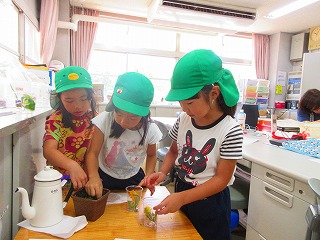 昨年から玄関でヒヤシンスの水栽培をしています。子どもたちは、根に目を向けて不思議そうに「なんだこれは…?」「おひげみたいだね。」とつぶやいています。蕾が膨らみ、今週白い花が開き始めました。