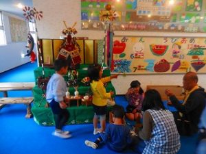 本日、五月人形を飾りました。子どもたちは、先生たちのお手伝いをしました。明日は、お天気が良くなったら園庭にこいのぼりを出します。
