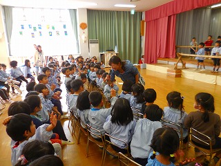 午後は年長組のお楽しみ会の竹太鼓グループが、年少・年中組をホールに呼んで演奏しました。