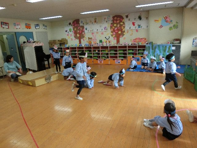初めてみんなでどんな話か話を聞きながら楽しんだので、いつもと少し楽しみ方が違ったようですが、皆でやったことでいつもとは違う楽しみもあったようです。終わった後、「もう一度やりたい。」という子がいたのが、それを表していました。話の筋は変わりませんが、成りたい動物が変わったり、楽しみ方が変わったりしながら「お楽しみ会」を迎えるのではないでしょうか。