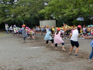 年少と満3歳児学級は綱引きのやり方が分かり、年長と年中の子ども達は、相手のペア学級には負けないようにしようという気持ちがわいたようです。これからもなかよし会で綱引きをすると思いますが、その時は今日よりもっと力が入るのではないかと思います。