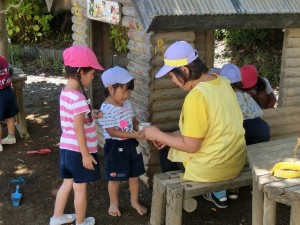 今日も残暑が厳しい1日でした。子ども達は園庭の真ん中付近の木陰にある「皆の家」の所で何やら楽しそうに話しながら遊んでいました。いつもたくさんの子ども達が、入れ代わり立ち代わりこの「みんなのいえ」でいろいろな遊びをしています。でも、今日のような日は、「みんなのいえ」の所は木陰で涼しいので同じ子どもが長いこと遊んでいました。
