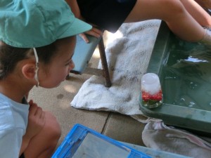 「足湯」ならぬ「「足氷水」です。子ども達は、「冷たい屋さん」と言って集まって、冷たい水で涼をとったり、入れた氷を掬い上げて手で冷たさを楽しんだりしていました。