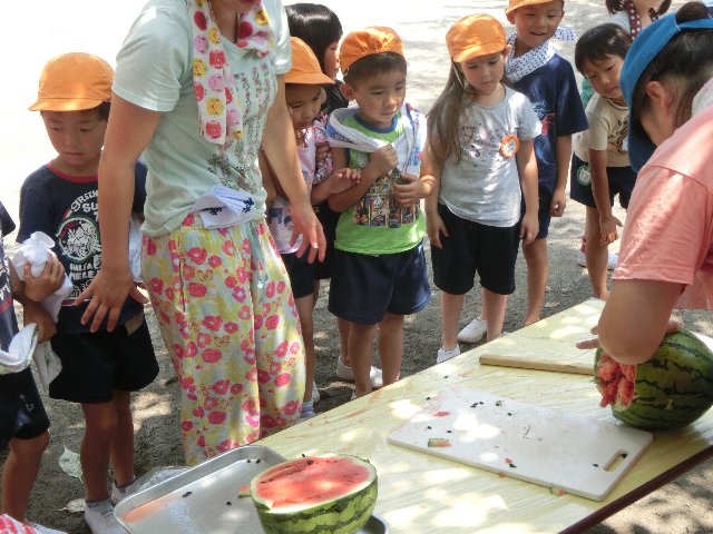 みんながスイカ割りを経験した後、そのスイカを切ってもらいました。早く食べたいという顔で、スイカを切っているのを見ていました。