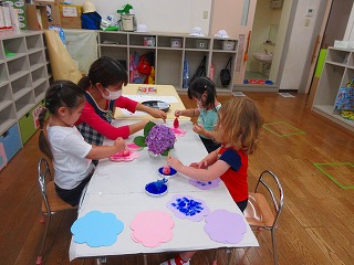 満3歳児は、アジサイの制作をしました。絵の具のスタンプをポンポン押して花を表現しました。「もっとやる!」「ポンポンする!」繰り返し楽しみました。