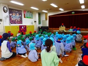 職員からは劇のプレゼントです。動物に扮した担任が登場すると、「〇〇先生、かわいい!」と