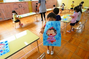 今日は完成した作品展会場を子どもたちが観て回りました。舞台のお化け屋敷に上がり、年長の男の子が「すごいな~。ひとつ、ひとつがすごいんだよなあ。」とひよこさんの作ったおばけを観てつぶやいていました。とても嬉しいつぶやきでした。
