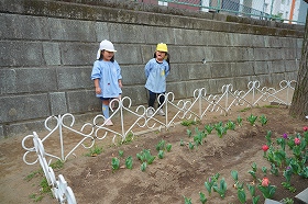 年中さんが植えたチューリップの球根が芽を出し、花を咲かせています。「素敵なチューリップ畑になるといいね。」とうさぎ小屋の裏の花壇になります。可愛らしいチューリップの前で、チューリップの歌をうたっていた年少さんがいました。テラスでは誰もいない年長さんのお部屋を、じっと見ていた年中さんもいました。大好きな年長さんがいない寂しさを感じたようです。