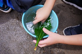 細かくした葉っぱはネットに入れ、水を入れ煮出します。次第に透明感のある茶色になり、薬草のようなにおいが漂いました。続きが楽しみです!素晴らしい自然体験だと思います。
