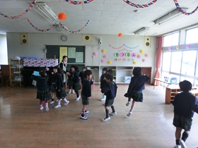 式が終わった後、年長さんたちは年中組の保育室へ向かいました。