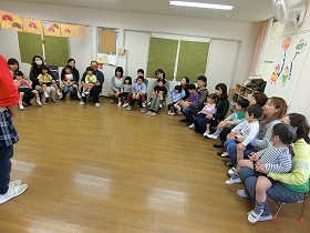 らいおん組さんの前では、「♪となりのおばさんちょっときておくれ♪」「♪鬼ーがいるから行かれない♪」“はないちもんめ”です。日本の伝統的な遊びです。懐かしい~!