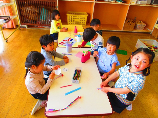 お昼近くになると、お弁当(給食)をもって、年中組のお部屋に