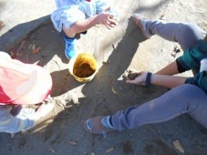 キャンプごっこしています。おかまのお米を研いでご飯の用意をしています。