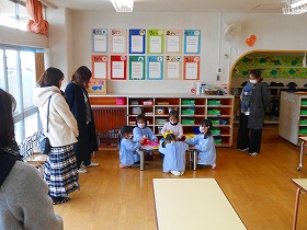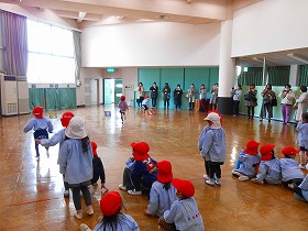 お友達はどんなな遊びをしているかな?年少さんが転がしドッジボールをしています。先生の投げてボールに当たらないように逃げています。(ドッジボールの「ドッジ」は、「避ける」という意味があります。)まさにドッジボールです。