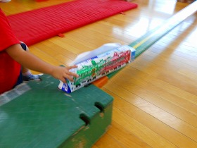 年長さんは何やら大きな白い布を取り出しました。あ!「あかだ~」みんなでもみもみ