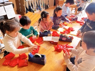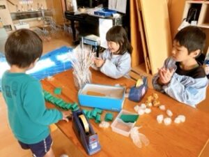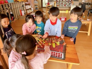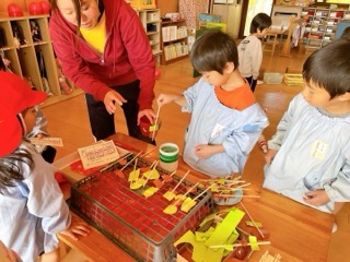 園庭で枝に枯葉をさして焼き鳥に見立てて遊んでいたところから、室内でいろいろな素