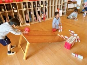 部屋にあるボーリングのピンを使って、自分達で楽しい遊び方を考えて遊ぶようになっ