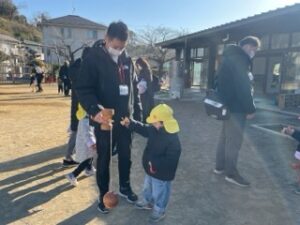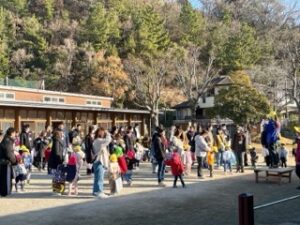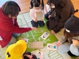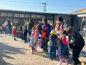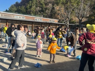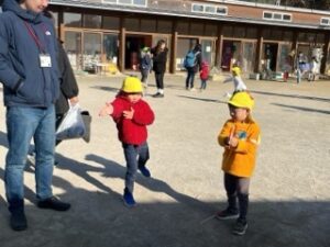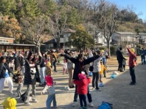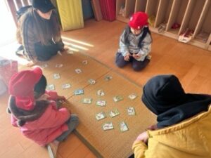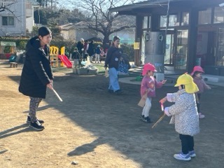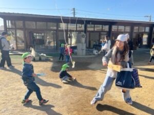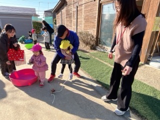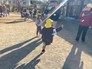 園庭で集まって、皆で「あけまして おめでとうございます」の挨拶をして、ふれあい遊