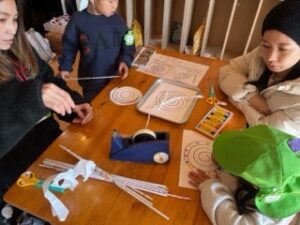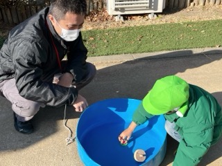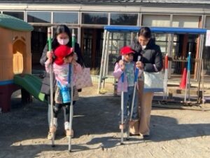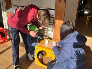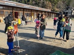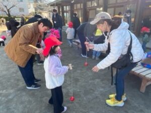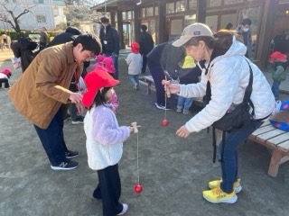 園庭では、3学年混ざって竹馬羽根つきけん玉コマや、部屋で作ったもので遊び