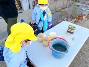 別の場所では、年長さんが氷を発見して集めて楽しんでいました❄️