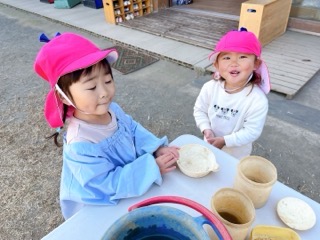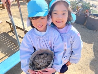 別の場所では、年長さんが氷を発見して集めて楽しんでいました❄️