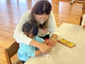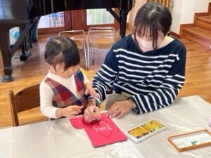 好きな色のブーツや紐を選んで、クレヨンで絵を描いたり、お母さんに手伝ってもらい