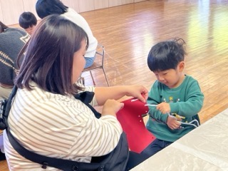 好きな色のブーツや紐を選んで、クレヨンで絵を描いたり、お母さんに手伝ってもらい