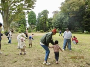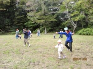 その後、広場では、先生がワニになり、捕まらないように親子で逃げる『ワニごっこ』