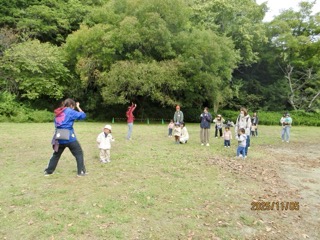 その後、広場では、先生がワニになり、捕まらないように親子で逃げる『ワニごっこ』