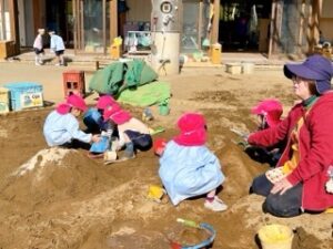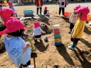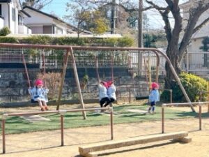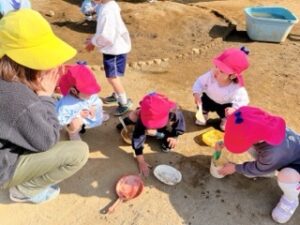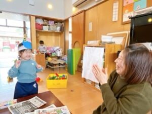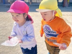 今週、年少・いちご組が可愛い鬼のお面をかぶって遊んでいるのをよく見かけます!