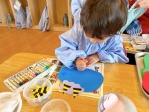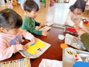 その後、各クラスに行ってみると、先生と一緒に鬼のお面を作っている子がたくさん