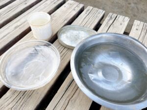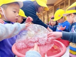 毎日氷作りを楽しんでいた年少・いちご組ですが、ついに、今日みどり組の前に出して