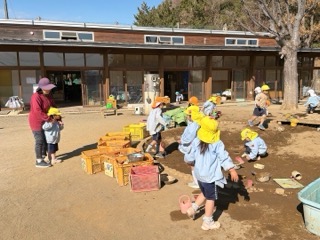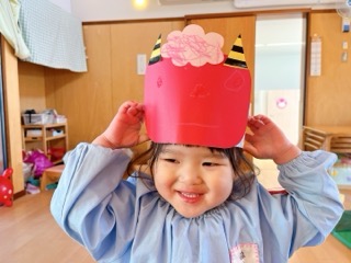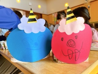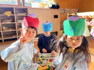 今週、年少・いちご組が可愛い鬼のお面をかぶって遊んでいるのをよく見かけます!