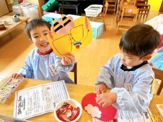 その後、各クラスに行ってみると、先生と一緒に鬼のお面を作っている子がたくさん