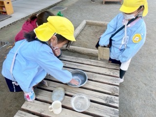 もも組のバケツの中には、水と一緒に落ち葉を入れていました。