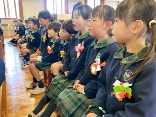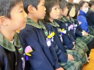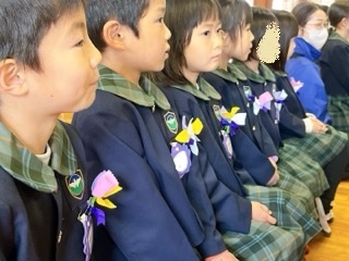 入場してきた年長組の胸には、先週のお別れ集会で年中組からプレゼントされたコサー